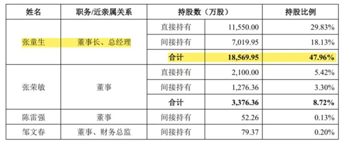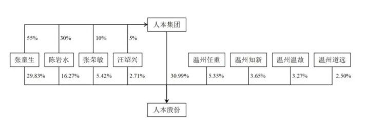 截止递表,人本股份总股本3.87亿股,由人本集团持股30.99%,而人本集团由张童生持股 55%,陈岩水持股 30%,张荣敏持股 10%,汪绍兴持股5%。